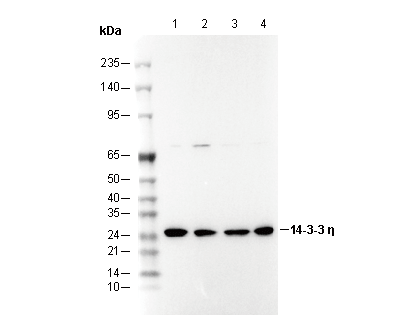 14-3-3 η Antibody [G4H24] recognizes endogenous levels of total 14-3-3 η. This antibody shows weak cross-reactivity with 14-3-3 γ but does not detect any other 14-3-3 family isoforms.