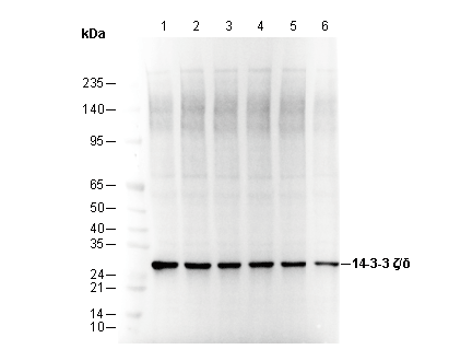 14-3-3 ζ/δ Antibody [E21B9] recognizes endogenous levels of total 14-3-3 ζ/δ protein. Although this antibody demonstrates a strong preference for 14-3-3 ζ/δ, it will also detect purified, recombinant 14-3-3 α/β. It does not cross-react with any other known mammalian 14-3-3 isoforms.