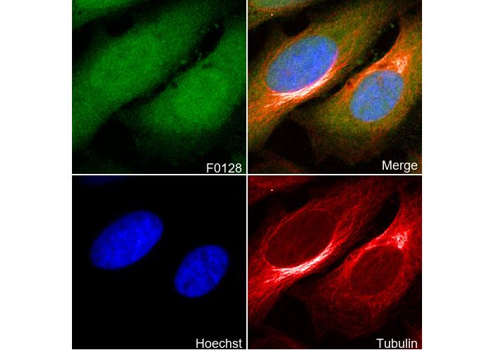 • Immunofluorescent analysis of Hela cells using F0128 (green, 1:800), Hoechst (blue) and tubulin (Red).