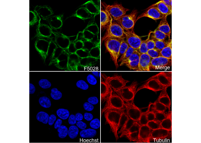 • Immunofluorescent analysis of 293T cells using F5028 (green, 1:200), Hoechst (blue) and tubulin (Red).