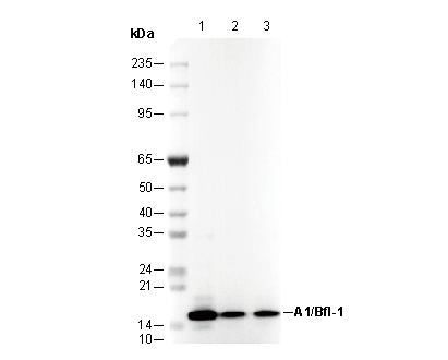 The Bcl-2-related protein A1 (also known as Bfl-1 or BCL2A1) is an anti-apoptotic member of the Bcl-2 family. Its expression is predominantly found in hematopoietic cells, though it has also been detected in non-hematopoietic tissues such as the lung and in endothelial cells. A1/Bfl-1 is rapidly upregulated by NF-κB activation in response to various stimuli, including TNF-α, IL-1β, CD40 ligation, phorbol esters, and LPS. A1/Bfl-1 inhibits apoptosis by binding to and neutralizing pro-apoptotic Bcl-2 family members, such as Bid and Bim, thereby preventing the release of cytochrome c from mitochondria. Interestingly, under specific conditions involving TNF stimulation and cycloheximide treatment in FL5.12 pro-B cells, human A1/Bfl-1 can be proteolytically cleaved by μ-calpain or a similar protease, converting it into a pro-apoptotic factor. A1/Bfl-1 has been implicated in autoimmunity, as well as in the progression and therapy resistance of hematological and solid tumors where its expression may be dysregulated. Beyond its role in apoptosis, A1/Bfl-1, like other anti-apoptotic proteins such as Bcl-2, Mcl-1, and Bcl-xL, can bind to Beclin1. This interaction inhibits autophagy, potentially by disrupting the formation of Beclin1-hVps34 complexes.