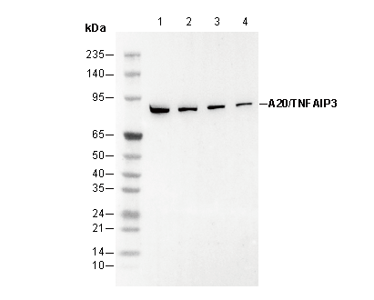 A20/TNFAIP3 Antibody [H4N11] recognizes endogenous levels of total A20/TNFAIP3 protein.