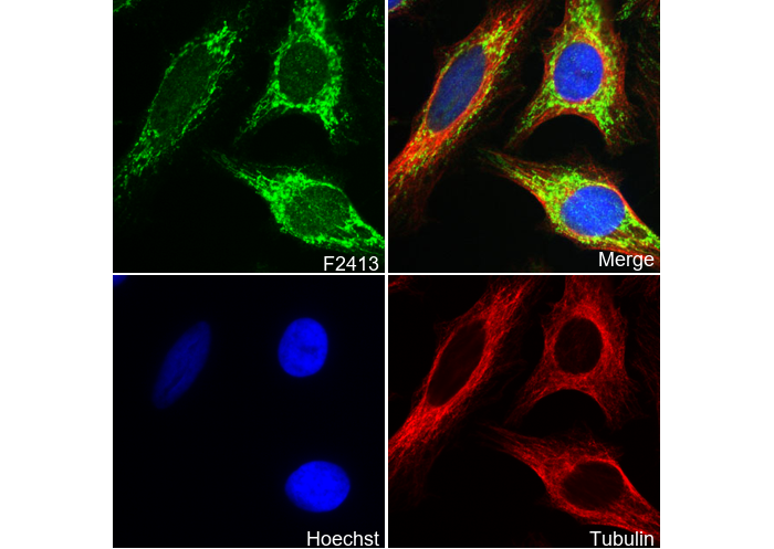 • Immunofluorescent analysis of Hela cells using F2413 (green, 1:50), Hoechst (blue) and tubulin (Red).
