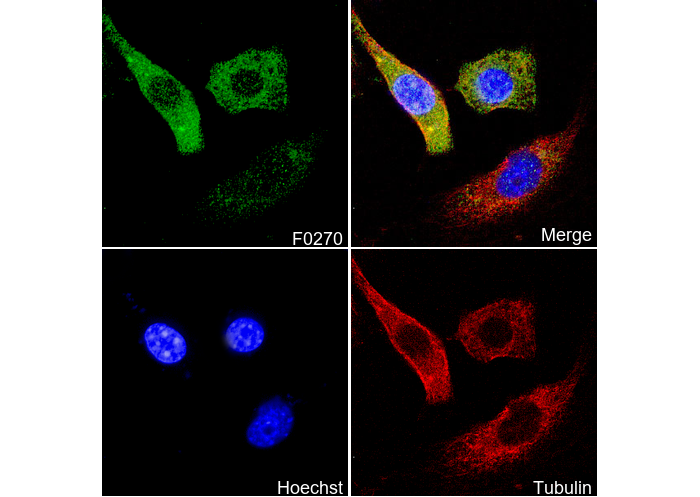 • Immunofluorescent analysis of NIH/3T3 cells using F0270 (green, 1:100), Hoechst (blue) and tubulin (Red).