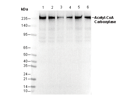 Acetyl-CoA Carboxylase Antibody [N24C17] recognizes endogenous levels of total Acetyl-CoA Carboxylase protein.