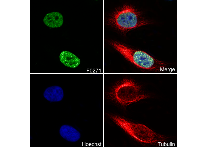 • Immunofluorescent analysis of Hela cells using F0271 (green, 1:200), Hoechst (blue) and tubulin (Red).
