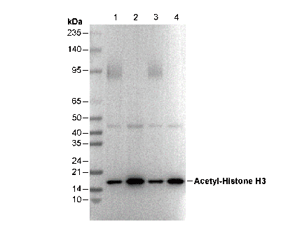 Acetyl-Histone H3 (Lys27) Antibody [L2M16] recognizes endogenous levels of total Acetyl-Histone H3 (Lys27) protein.