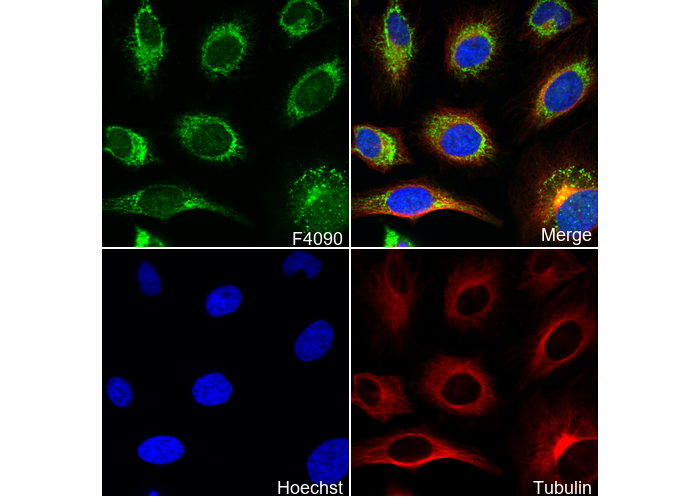 • Immunofluorescent analysis of Hela cells using F4090 (green, 1:200), Hoechst (blue) and tubulin (Red).