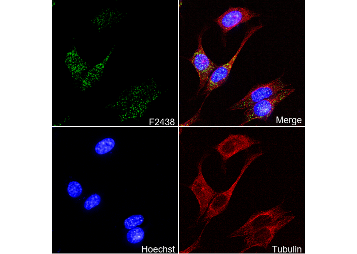 • Immunofluorescent analysis of NIH/3T3 cells using F2438 (green, 1:250), Hoechst (blue) and tubulin (Red).