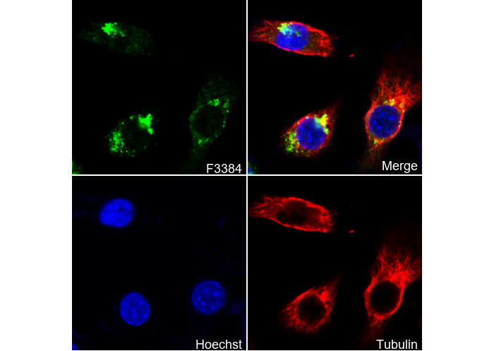 • Immunofluorescent analysis of NIH/3T3 cells using F3384 (green, 1:1000), Hoechst (blue) and tubulin (Red).