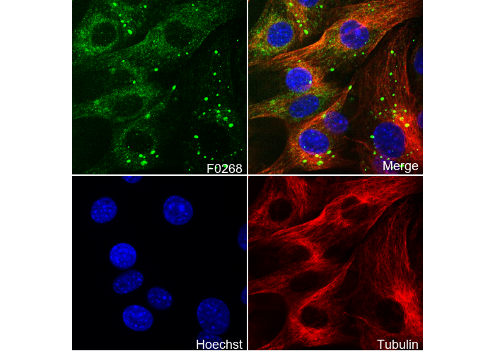 • Immunofluorescent analysis of C2C12 cells using F0268 (green, 1:200), Hoechst (blue) and tubulin (Red).