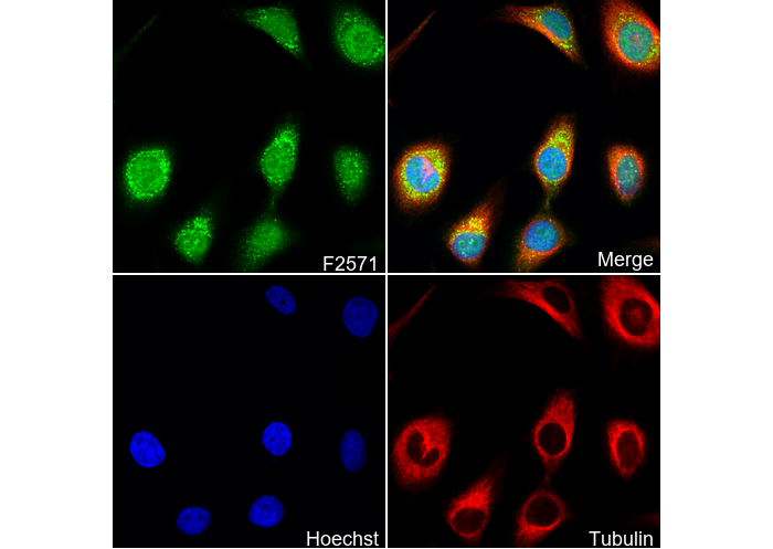 • Immunofluorescent analysis of Hela cells using F2571 (green, 1:500), Hoechst (blue) and tubulin (Red).