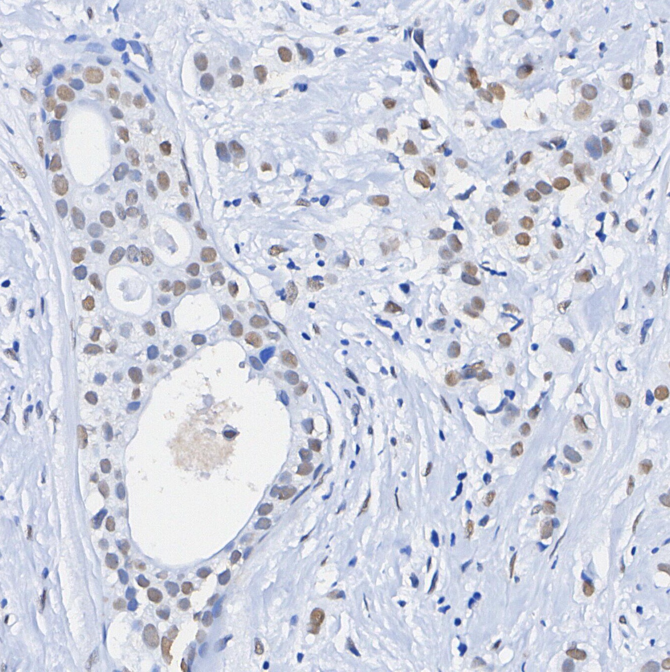 • Immunohistochemical analysis of formalin fixed paraffin embedded human Breast cancer tissue with F1663 at 1/100 dilution.
