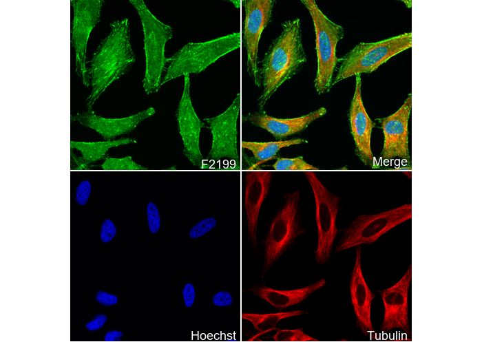 • Immunofluorescent analysis of Hela cells using F2199 (green, 1:70), Hoechst (blue) and tubulin (Red).