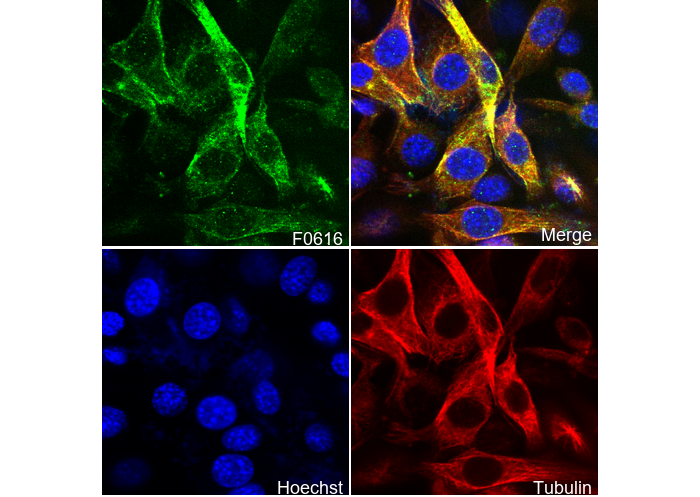 • Immunofluorescent analysis of NIH/3T3 cells using F0616 (green, 1:100), Hoechst (blue) and tubulin (Red).
