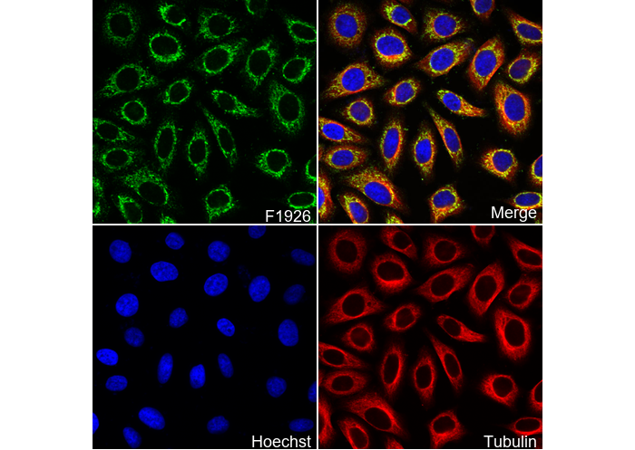 • Immunofluorescent analysis of MCF7 cells using F1926 (green, 1:500), Hoechst (blue) and tubulin (Red).
