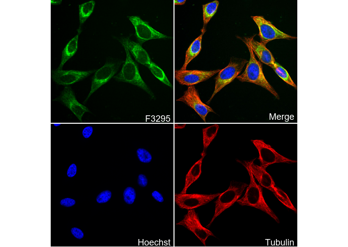 • Immunofluorescent analysis of Hela cells using F3295 (green, 1:250), Hoechst (blue) and tubulin (Red).