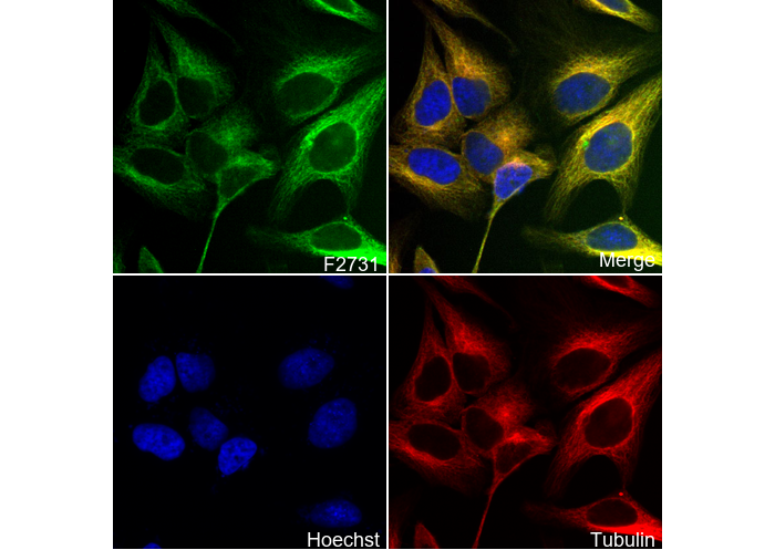 • Immunofluorescent analysis of Hela cells using F2731 (green, 1:10000), Hoechst (blue) and tubulin (Red).