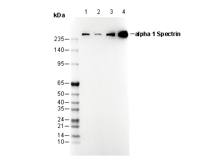 α1 Spectrin Antibody [G20F14] recognizes endogenous levels of total alpha-1-spectrin protein.