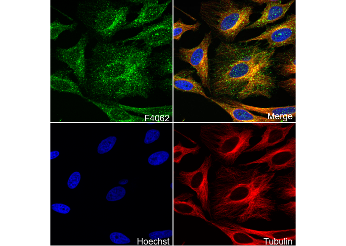 • Immunofluorescent analysis of Hela cells using F4062 (green, 1:100), Hoechst (blue) and tubulin (Red).
