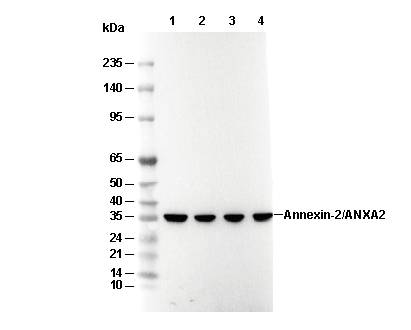 Annexin-2/ANXA2 Antibody [P8A6] detects endogenous levels of total Annexin-2/ANXA2 protein.