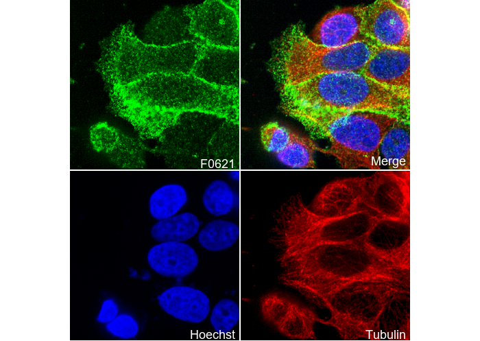 • Immunofluorescent analysis of MCF-7 cells using F0621 (green, 1:100), Hoechst (blue) and tubulin (Red).