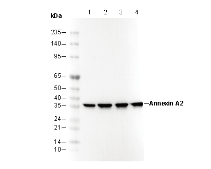 Annexin A2 Antibody [B17C13] recognizes endogenous levels of total annexin A2 protein.