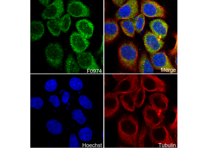 • Immunofluorescent analysis of HepG2 cells using F0974 (green, 1:100), Hoechst (blue) and tubulin (Red).