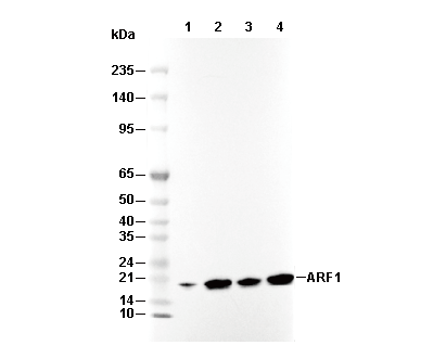 • Lane 1: 293T, Lane 2: 293T (transfected with human ARF1), Lane 3: Hela, Lane 4: Caki-1