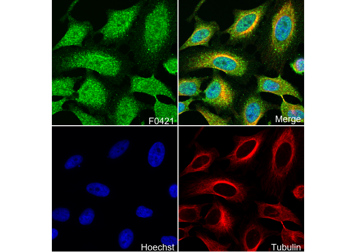 • Immunofluorescent analysis of Hela cells using F0421 (green, 1:50), Hoechst (blue) and tubulin (Red).