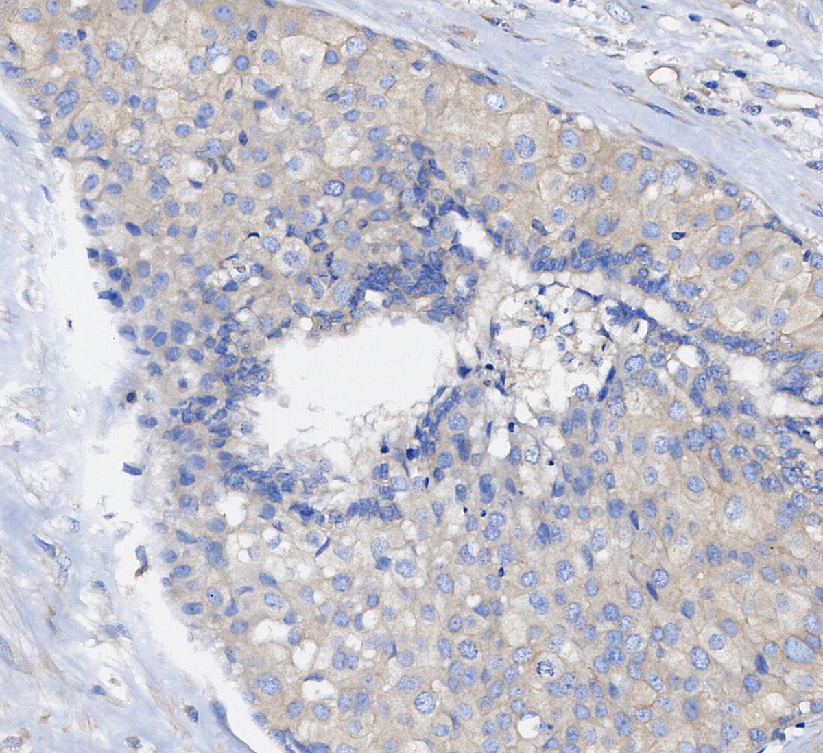 • Immunohistochemical analysis of formalin fixed paraffin embedded human breast cancer tissue with F0421 at 1/200 dilution.