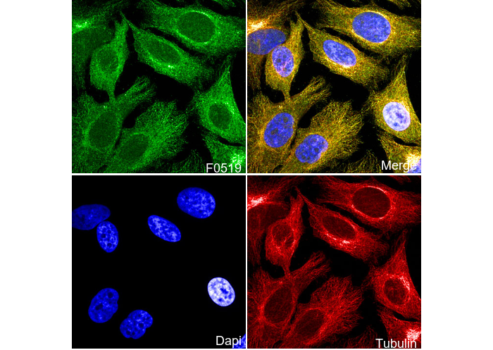 • Immunofluorescent analysis of Hela cells using F0519 (green, 1:100), Hoechst (blue) and tubulin (Red).
