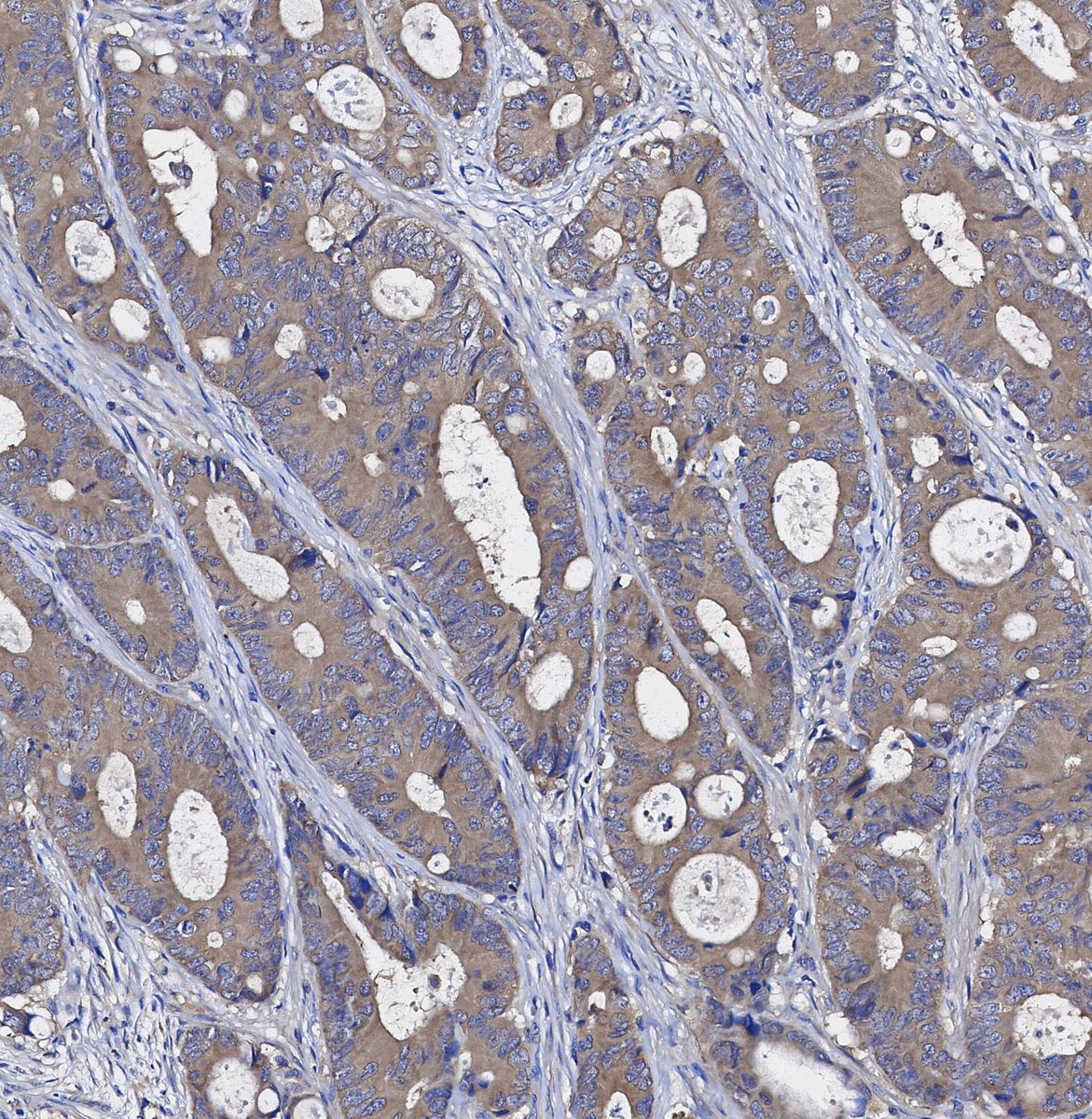 • Immunohistochemical analysis of formalin fixed paraffin embedded human Colorectal cancer tissue with F0519 at 1/100 dilution.