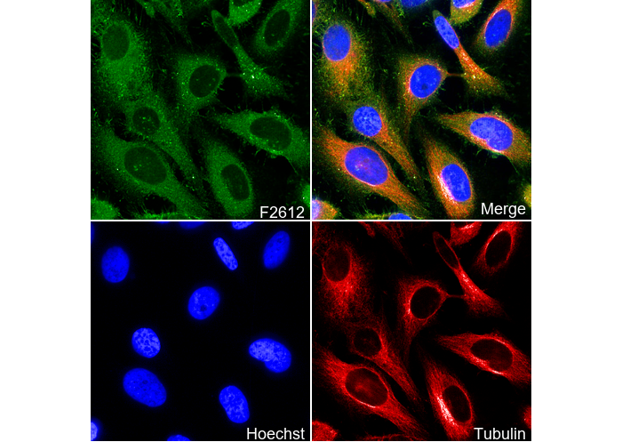 • Immunofluorescent analysis of Hela cells using F2612 (green, 1:100), Hoechst (blue) and tubulin (Red).