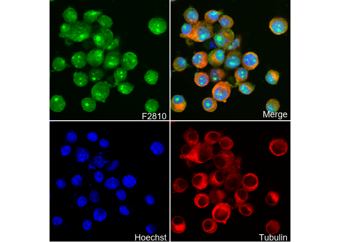 • Immunofluorescent analysis of Neuro-2a cells using F2810 (green, 1:50), Hoechst (blue) and tubulin (Red).