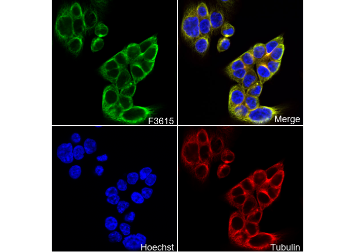 • Immunofluorescent analysis of HT-29 cells using F3615 (green, 1:500), Hoechst (blue) and tubulin (Red).