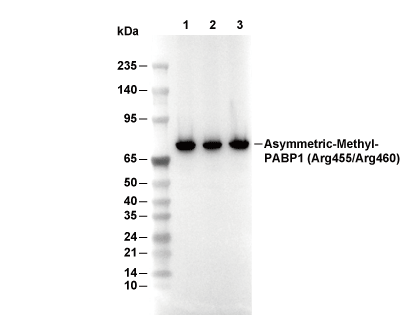 Asymmetric-Methyl-PABP1 (Arg455/460) Antibody [P20H17] detects endogenous levels of total PABP1 protein only when it is methylated at Arg455 or Arg460.
