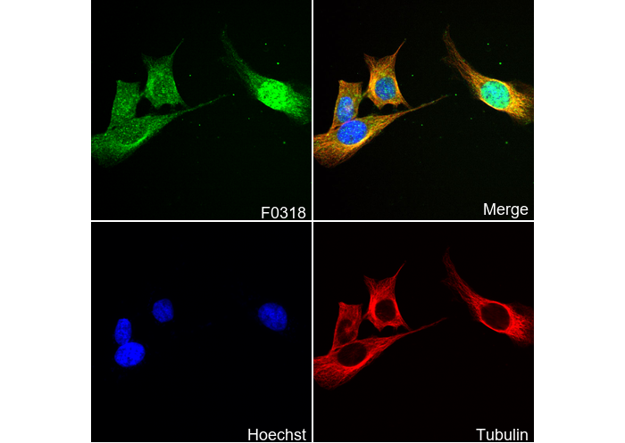 • Immunofluorescent analysis of Hela cells using F0318 (green, 1:100), Hoechst (blue) and tubulin (Red).