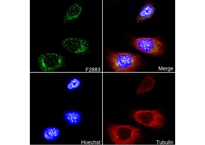 • Immunofluorescent analysis of NIH/3T3 cells using F2883 (green, 1:50), Hoechst (blue) and tubulin (Red).