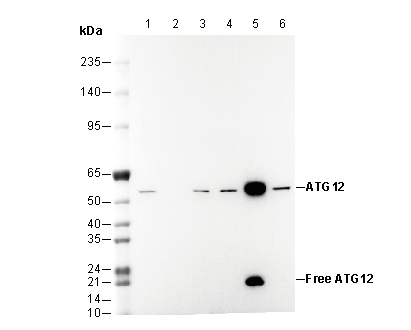 • Lane 1: HAP1 , Lane 2: HAP1 (KO Atg12) , Lane 3: HeLa , Lane 4: 293T , Lane 5: NIH/3T3 , Lane 6: PC-12