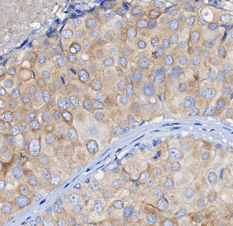 • Immunohistochemical analysis of formalin fixed paraffin embedded human breast cancer tissue with F1073 at 1/200 dilution.