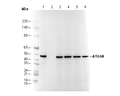 • Lane 1: C2C12 , Lane 2: C2C12 (koATG4A) , Lane 3: HepG2 , Lane 4: Jurkat , Lane 5: Fetal brain , Lane 6: Fetal liver