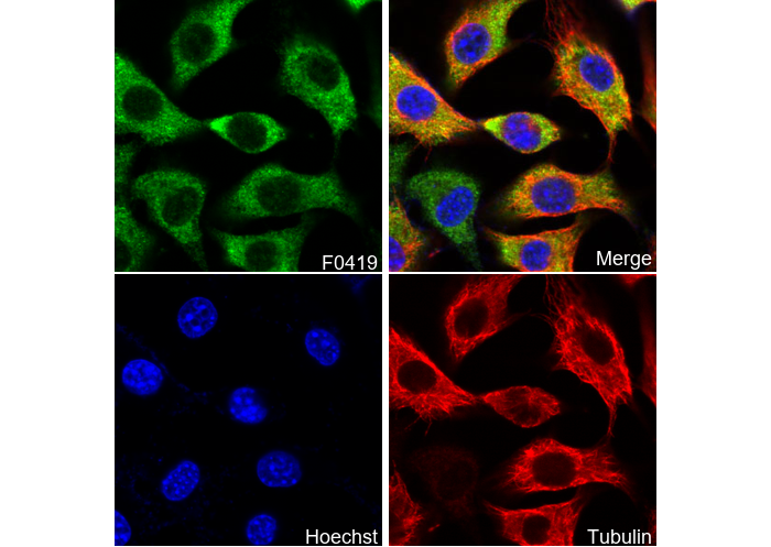 • Immunofluorescent analysis of NIH/3T3 cells using F0419 (green, 1:400), Hoechst (blue) and tubulin (Red).