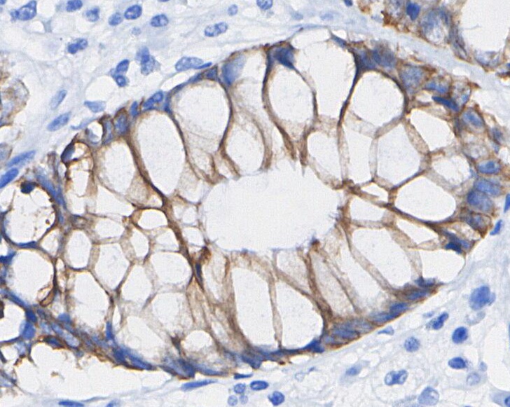 • Immunohistochemical analysis of formalin fixed paraffin embedded human Colorectal cancer tissue with F0419 at 1/50 dilution.