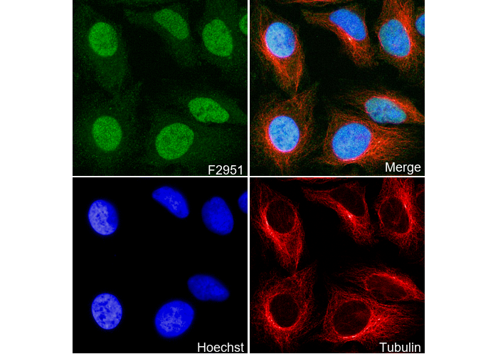 • Immunofluorescent analysis of Hela cells using F2951 (green, 1:250), Hoechst (blue) and tubulin (Red).