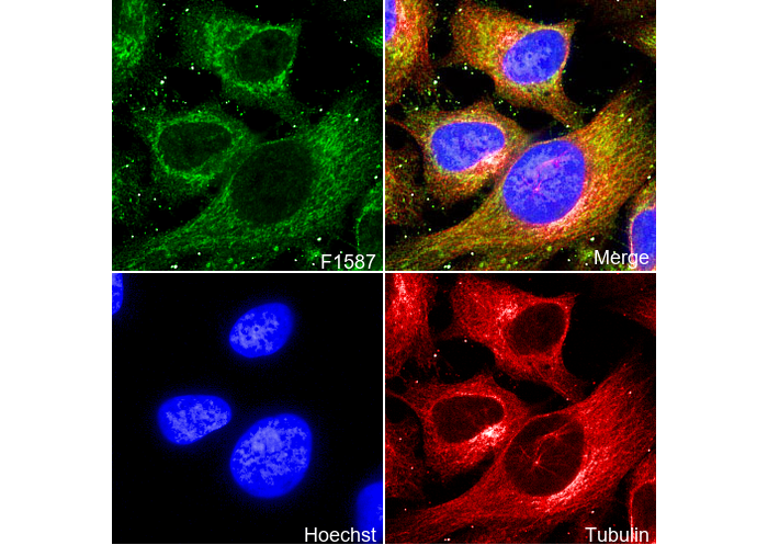 • Immunofluorescent analysis of Hela cells using F1587 (green, 1:100), Hoechst (blue) and tubulin (Red).