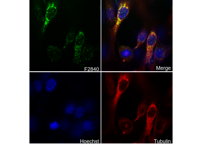 • Immunofluorescent analysis of NIH/3T3 cells using F2840 (green, 1:250), Hoechst (blue) and tubulin (Red).