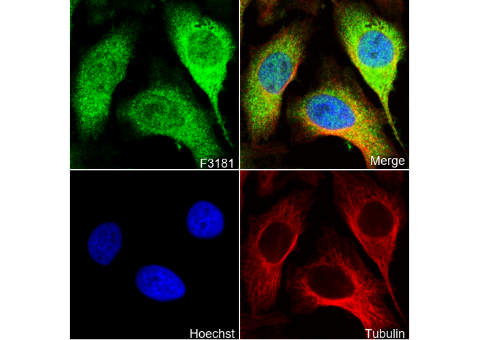 • Immunofluorescent analysis of Hela cells using F3181 (green, 1:60), Hoechst (blue) and tubulin (Red).