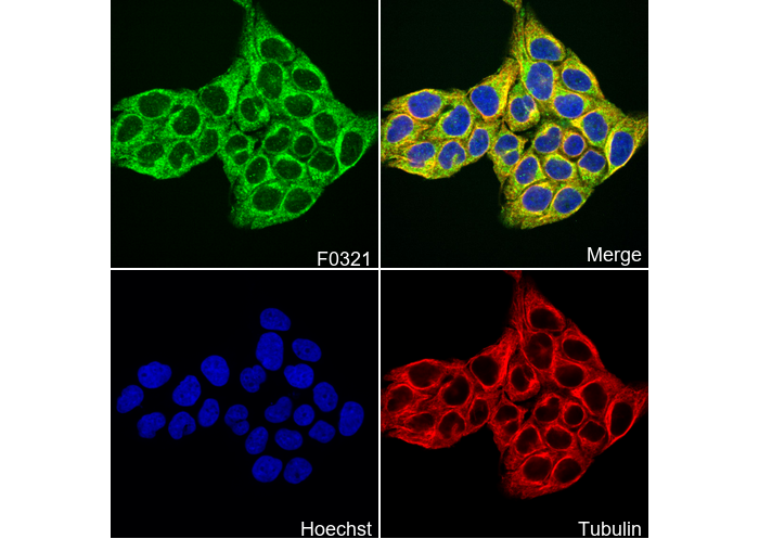 • Immunofluorescent analysis of HuH-7 cells using F0321 (green, 1:100), Hoechst (blue) and tubulin (Red).