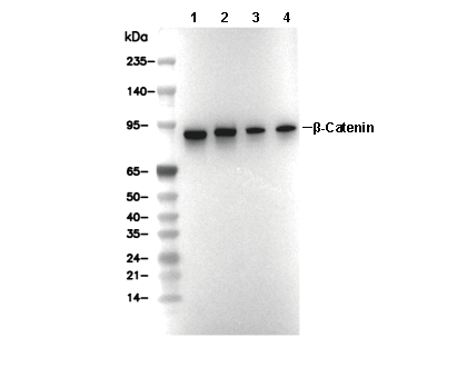 β-Catenin Antibody [E8L3] detects endogenous levels of total β-Catenin protein.